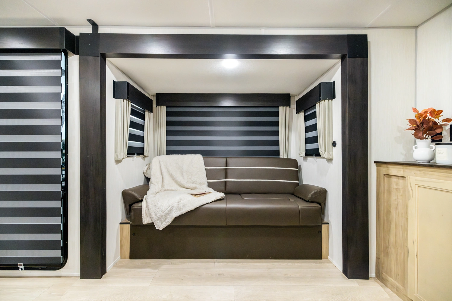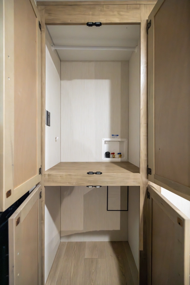 The triple slide is the perfect unit for affordable luxury and livability. The rear entertainment living room is surrounded by panoramic windows as well as two sofa slide and two recliners. The chef’s kitchen, kitchen bar with stools, and dinette slide with slide out drawers and full door pantry offer meet the needs of any chef. The private master suite completes the interior. Outside enjoy the Cherokee camp kitchen, outside entertainment speakers, and TV bracket under our power awning.