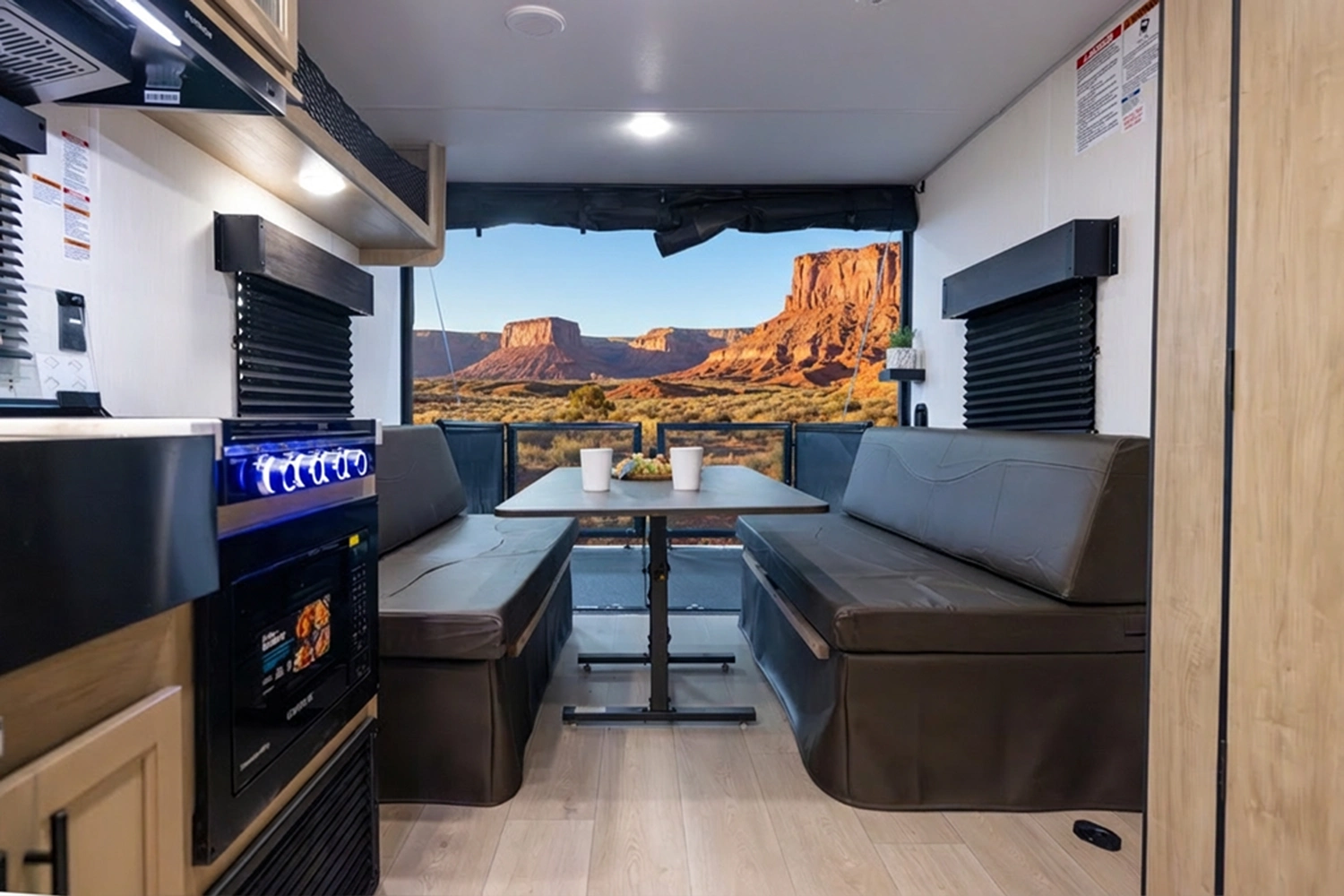 The Cherokee Grey Wolf 22RR by Forest River is the ultimate RV for outdoor enthusiasts. The spacious toy hauler garage, with a convertible rear ramp, provides ample space for toys and gear. The outdoor kitchen, shower, and patio area offer a luxurious outdoor living experience. Inside, you'll find a comfortable bedroom with a walk-around queen bed and a well-appointed bathroom. The modern kitchen, with its black stainless steel farm sink and sink cover, is perfect for cooking and entertaining.